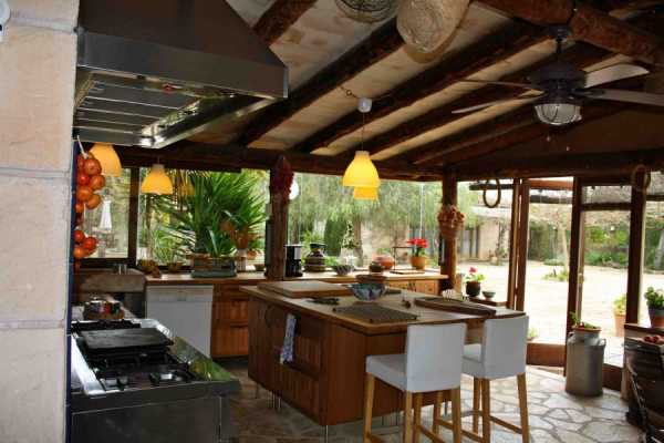 - кухню нужно обустраивать там, где она не будет продуваться ветрами, но при этом в нее получат доступ солнечные лучи.