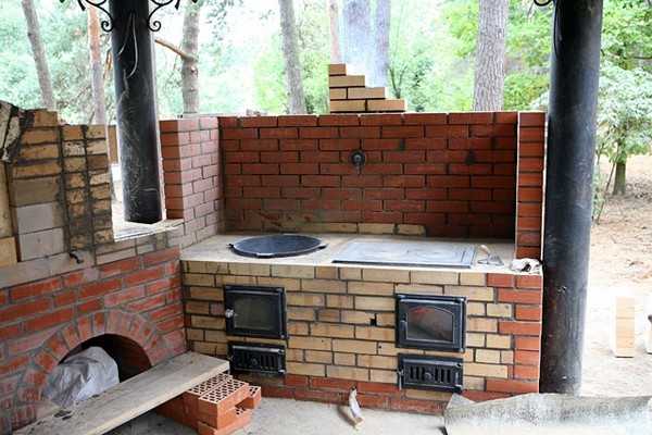 Печь для летней кухни открытого вида может быть различных вариантов, в зависимости от назначения. Если вы планируете приготовление горячих блюд, можно пригласить опытного печника, он выложит печь из кирпича.