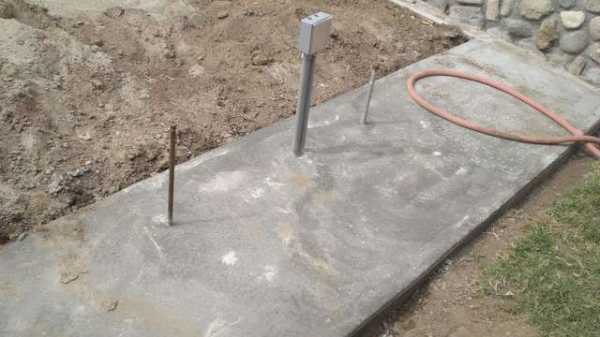 - Устанавливаем опоры из металлических труб – с одинаковым успехом можно применять как круглую, так и профильную трубу. Последняя даже немного лучше в силу своих эстетических характеристик, к примеру, часть трубы можно будет оставить не облицованной камнем. Установить трубу можно двумя способами – забетонировать в основании на этапе заливки фундамента или просто закрепить анкерами, предварительно приварив к трубе пяту и просверлив в ней четыре отверстия. Если пойдете последним путем, то нужно будет дождаться полного высыхания бетонного основания.