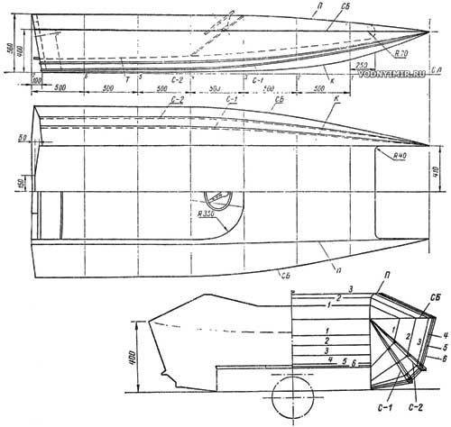 Чтобы сэкономить больше свободного места на фанере, рекомендуется вычерчивать проекции бока и полушироты одну на другой, выделяя их разными оттенками. Проекция корпуса должна отражать ветки шпангоута сразу с нескольких бортов – правого и левого. Их лучше всего совместить в кормовую, а также в носовую группу.