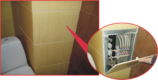 Наметьте место установки люка. Он должен располагаться напротив тех объектов, к которым необходим свободный доступ, а наклеенная на него плитка должна полностью совпадать с расположением рядов плиточной облицовки стен.