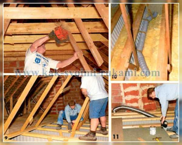 Утепление кровли и вертикальных стенок мансарды выполняют изнутри, размещая материал между стропилами, стойками пристенков, поверх подшивки потолка.