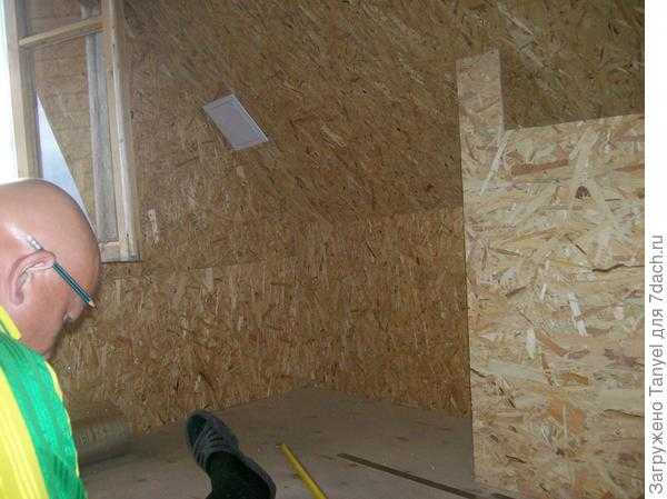 В качестве утеплителя использовали самый доступный нам в тот момент вид — пенопласт, отделка — плиты OSB. А когда начали заниматься отделкой, стало понятно, что крыша собрана не просто из отходов пилопроизводства, а еще и вкривь и вкось…