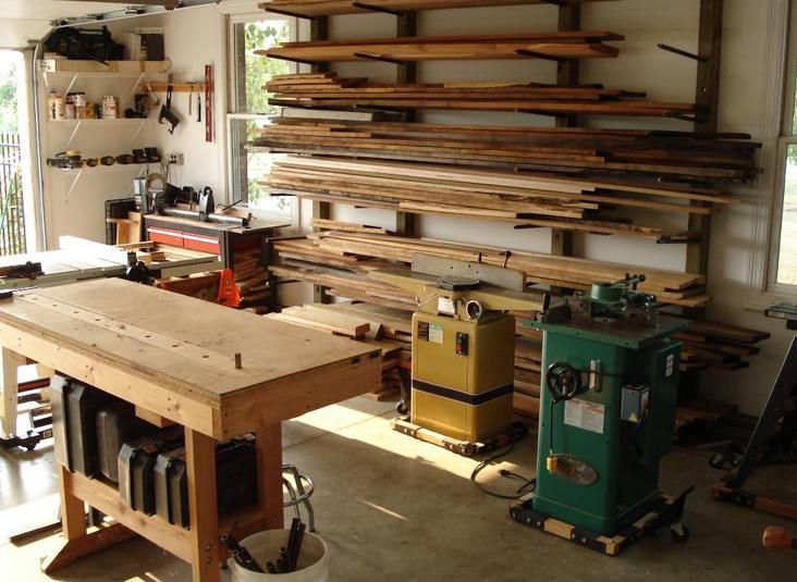 Если стеллаж или место для хранения длинномерных заготовок и материалов решено было разместить внутри мастерской, то они должны располагаться напротив ее входной двери. Оборудование, предназначенное для распиливания и раскроя, должно располагаться тут же поблизости. То есть рядом со стеллажом для материалов, чтобы заготовки не надо было для первоначальной обработки переносить на другой конец мастерской.