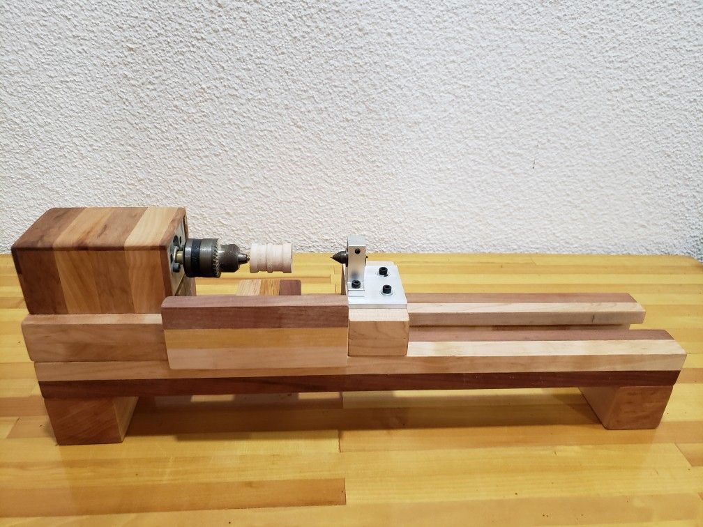 Сначала на станину устанавливается передняя бабка. Она представляет собой прочную опору. Саморезами и клеем добиваются прочного соединения деталей. После полимеризации клея изделие разобрать нельзя, оно приобретет необходимую жесткость.