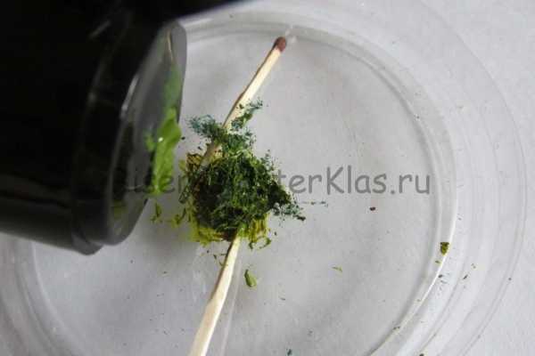 - Поролон режется или рвется на мелкие кусочки и прокрашивается в подходящие цвета. За образец можно взять фотографию натурального мха. Когда заготовка просохнет, клочки клеятся в задуманное место.