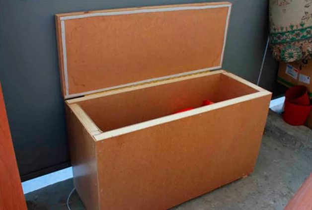 Далее производится внутренняя обшивка всех поверхностей короба фанерой или ДСП (кроме верхней, где будет крышка). С наружной стороны ящика прокладывается слой утеплителя, который зашивается плитами. По такому же принципу изготовляют крышку, которую крепят на петли.