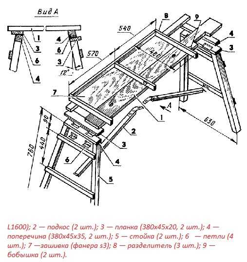 Оно будет состоять из доски, выполняющей роль основания, двух рам и разъемных подкосов. Процесс изготовления:- На пол параллельно друг другу уложить поперечный брусок и планку.