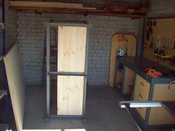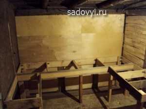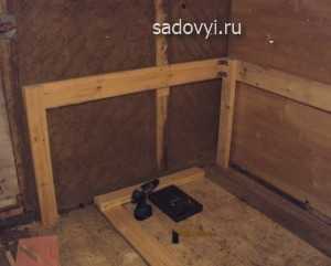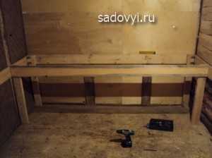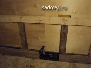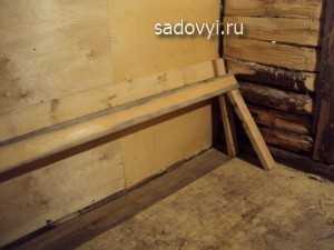 - На расстоянии от 40 до 50 см от пола можно зафиксировать деревянный щит, который будет служить местом одновременно и для хранения инструментов, и дополнительной стяжной опорой.