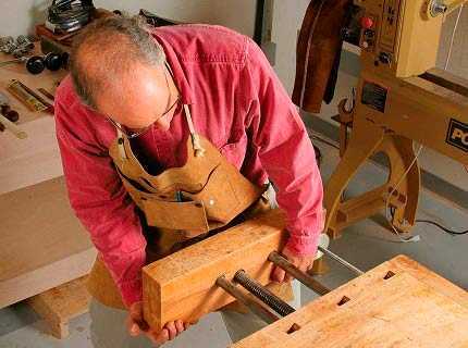 Для удобства обработки вертикальных заготовок и деталей. В рабочей поверхности верстака нужно сделать вырез. В этом вырезе деталь надежно крепится с помощью клина.