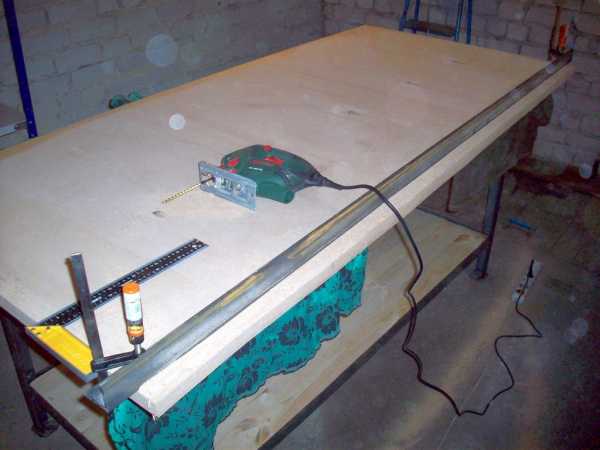 Новая столешница должна быть чуть больше старой, иметь напуск с каждой стороны в 15-20 см, чтобы можно было удобно и надежно навесить оборудование. В местах установки электрического оборудования для верстака можно положить двойной слой доски, чтобы основание было крепче.