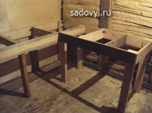 Начать можно со сборки столешницы, для производства которой нам необходимо будет создать корпус по периметру (обязательно учитывая напуск с каждой стороны). Корпус нужно будет укрепить деревянным брусом, создавая тем самым повышенную прочность.