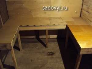 - Подготовить материал для столешницы. В этом качестве можно применять не только натуральную древесину, но и ДСП, фанеру и др. Чтобы упрочить ДСП и иные подобные материалы, поверх их желательно наклеить хотя бы тоненький лист фанеры.