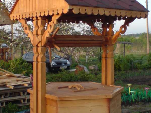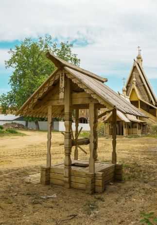 Колодец с деревянной крышкой и навесом, украшенным резьбой
