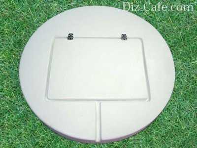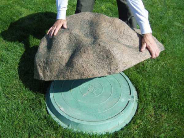 После высыхания плиту следует поднять из земли и установить на колодец. Стыки обработать цементным раствором. С помощью дюбелей прикрутить петли и вмонтировать люк. Его делают из любого материала. Бетонная крышка внешне выглядит довольно грубо. Украсить такую конструкцию можно с помощью искусственных валунов, гипсовых фигурок, пластиковых имитаций спилов дерева, замаскировать с помощью цветочных и растительных композиций.