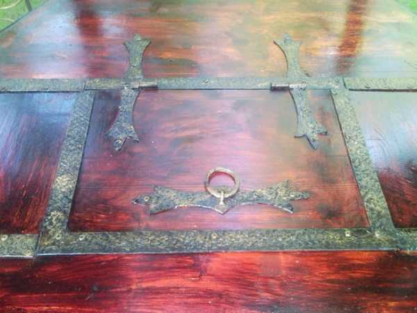 - Снаружи к откидному люку прикручивается ручка. Можно прибить шлифованный брусок, но металлическая или деревянная покупная ручка смотрится как эстетичное изделие.