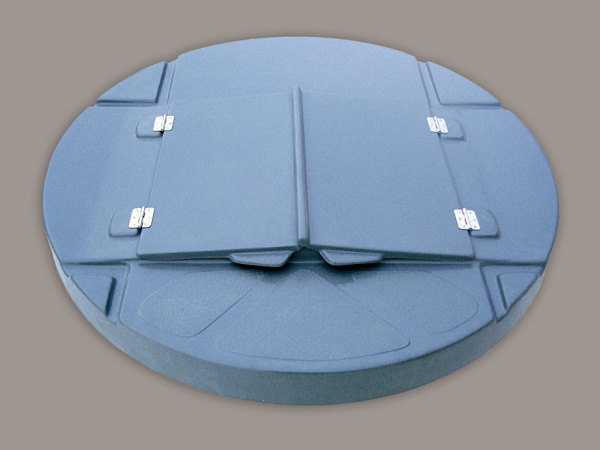 Пластиковые изделия выполняются из прочного полиуретана. Такая кровля безопасна, долговечна, имеет низкую теплопроводность, не позволяет воде замерзать в сильные морозы, уберегает от попадания в шахту мусора. Покупают в уже готовом виде и монтируют на верхнее бетонное кольцо.