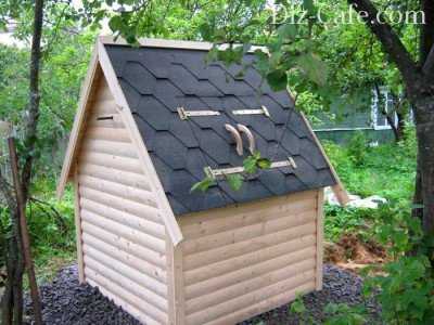 Очень эстетично смотрятся установленные поверх горловины колодца домики с двускатной крышей. Все деревянные детали в обязательном порядке обработать антисептиками. Для начала следует изготовить каркас из брусьев. Крепить детали между собой лучше всего с помощью уголков и саморезов.