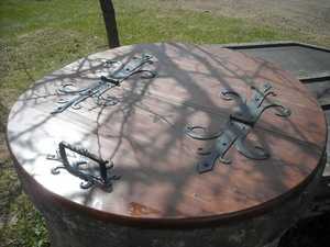 Металлические конструкции прочны и долговечны. Для их изготовления подходит листовой металл толщиной от 2 мм. Чтобы у владельцев не возникало проблем с доступом к воде, конструкции оборудуются удобной ручкой. Можно приобрести готовую крышку или сделать своими руками. И промышленная, и самодельная крышка должна быть с обеих сторон прогрунтована и обработана антикоррозийным составом. Кроме функционального элемента – ручки, к крышке можно приварить металлические кованые украшения.