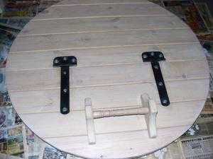- Вырезанные доски сбивают в «дверцу» и при помощи металлических шарниров соединяют с основной крышкой.