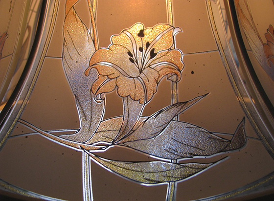 Рисунок на стекле актуален везде, где имеется подходящей площади для его нанесения поверхность. Прекрасным дополнением расписанной дверной стеклянной вставки станет аналогично оформленный абажур настенного бра, торшера или потолочного светильника. Можно декорировать интерьер витражными картинами.