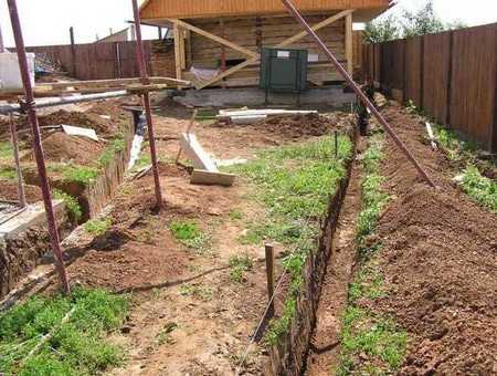 - выкапываются траншеи шириной 50 см и глубиной 80-100 см. Обеспечивается уклон траншей около 3 градусов по направлению к водостоку;