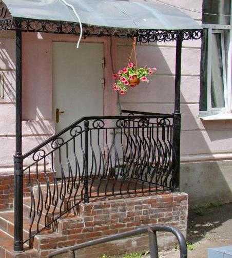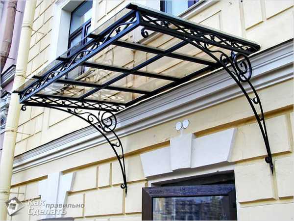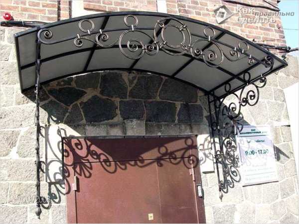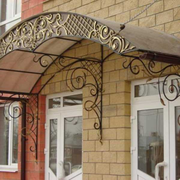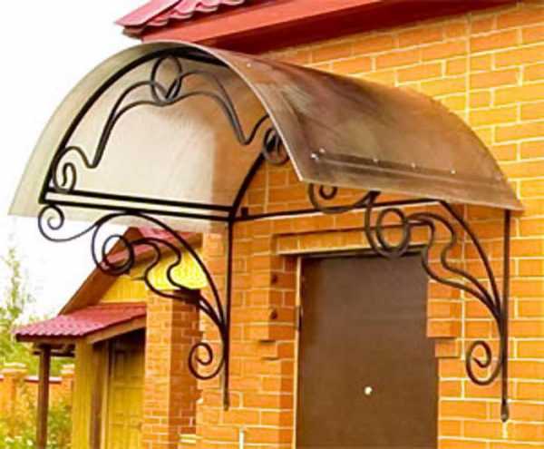 Опору для монтажа козырька можно сделать не только из дерева, но и из металла. Чаще всего используют профтрубу квадратного сечения. На ее основе можно сделать простые кронштейны или изящные навесы для дверей, собранные из гнутых деталей. Металлическая опора хорошо подходит для кровли из пластика: тонкие детали пропускают много света и козырек получится воздушным и легким.