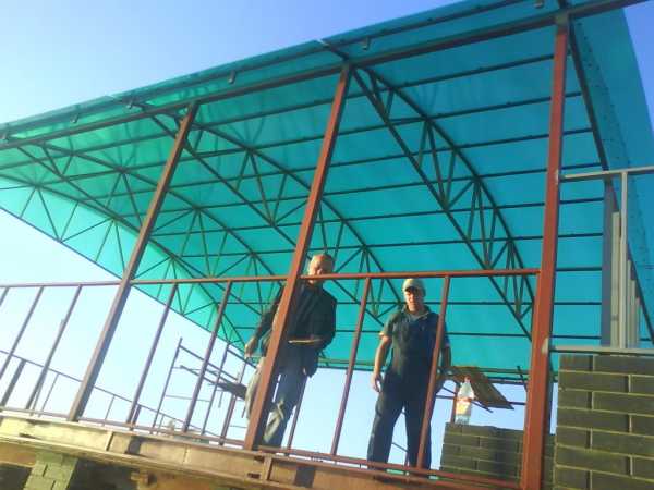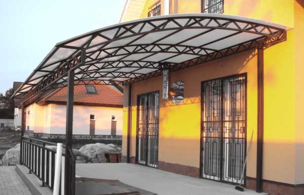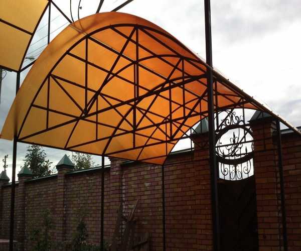 Для двухскатной или арочной конструкции делают 2-3 полукруглых или А-образных кровельных фермы. Соединить их надо в нижней части, у свободных концов, и в высших точках. Для соединения используют трубу или брусок, длина которого определяется выносом козырька от стены. Опоры для каркаса кровли сделать на столбах или кронштейнах, как указано выше. Кровельный материал монтировать по общим принципам.