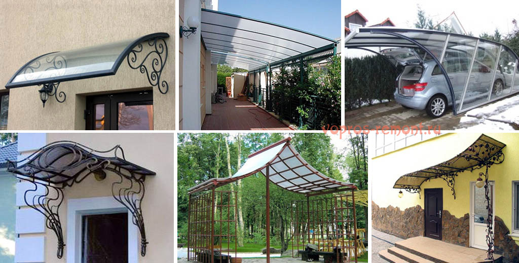 Способы крепления элементов навеса определяют характер материала и размеры конструкции.