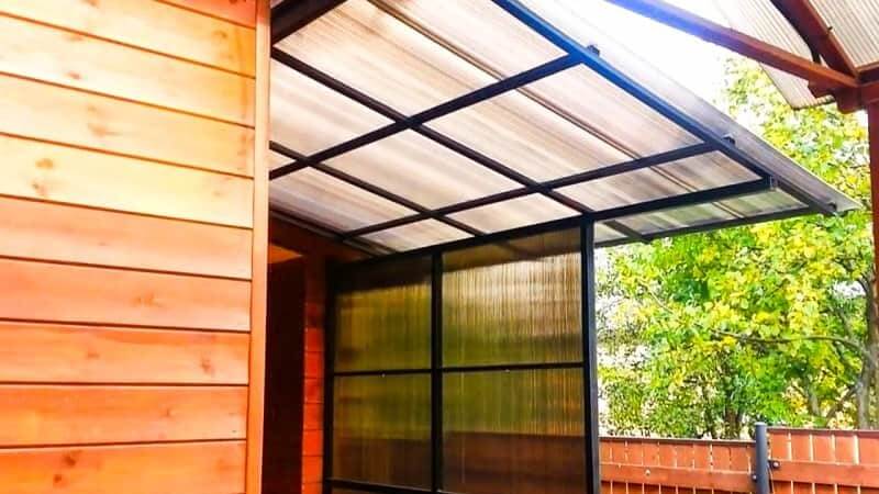 Для навеса потребуется материал для каркаса — профильные трубы или деревянный брус, а для обшивки — листы поликарбоната, жесть, шифер, доски, стеклянные панели и др.
