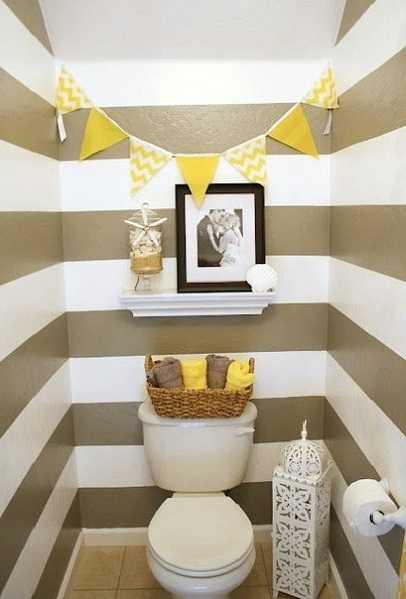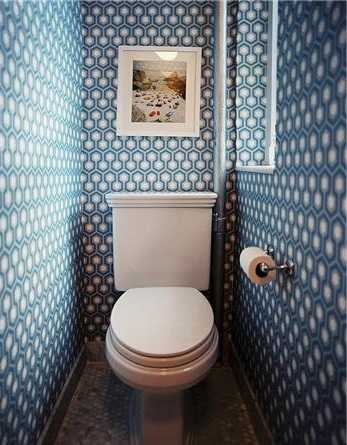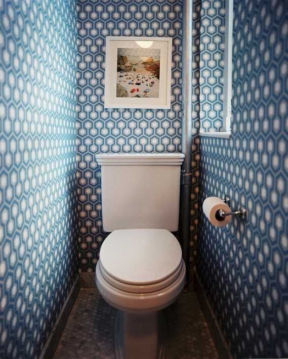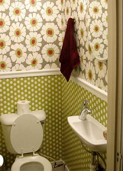 Выбирая активный рисунок для стен, откажитесь от навесных шкафов в туалете.