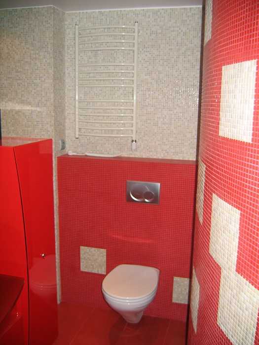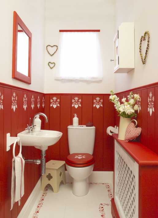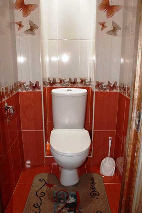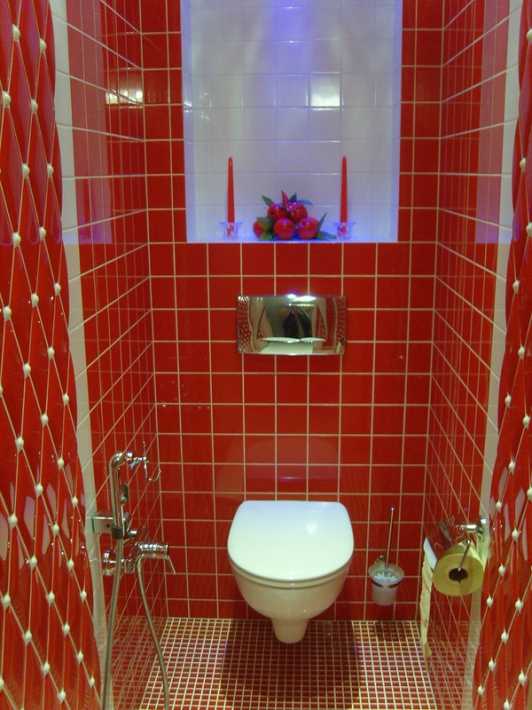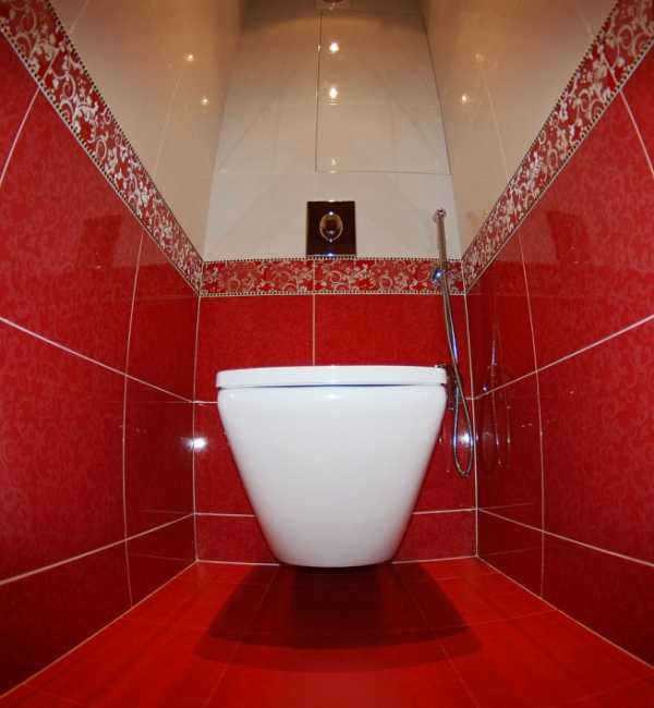 На этом фото использована уже красная плитка с узорами, но цвет разделяет туалет на две части, по высоте унитаза.