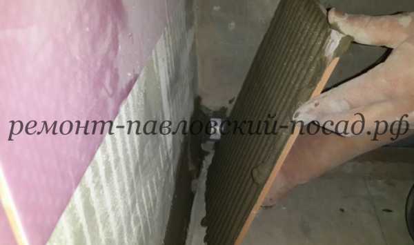 - Плитка монтируется, начиная с нижней части стены. Укладка производится небольшими частями, после чего делается затирка швов.