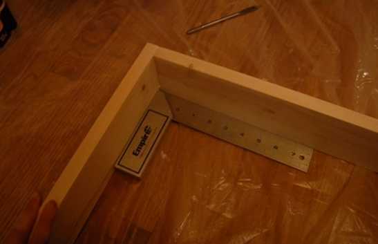 Примерно на середине высоты ножек крепим перекладины. Это каркас для полочки. Полочку можно использовать по назначению, а еще она увеличивает жесткость конструкции. Крепим строго под прямыми углами, проверяя при помощи большого угольника.