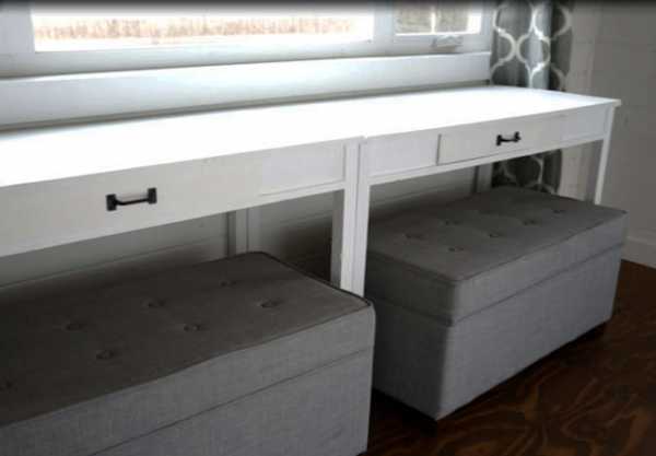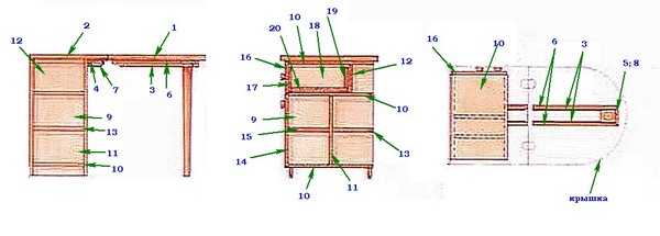 Дальше показан порядок сборки, основные части – столешница, тумбочка и выдвижной ящик. Обратите внимание на оригинальное решение двухсторонней тумбочки.