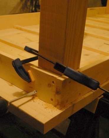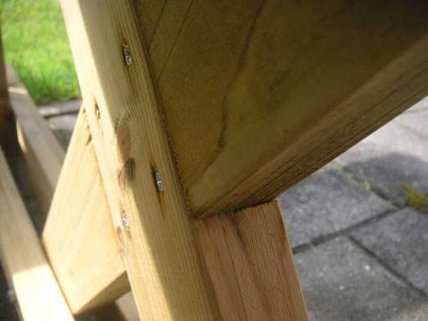 - Собирают ножки и опору для настила скамейки. Места соединений проклеивают и стягивают саморезами.