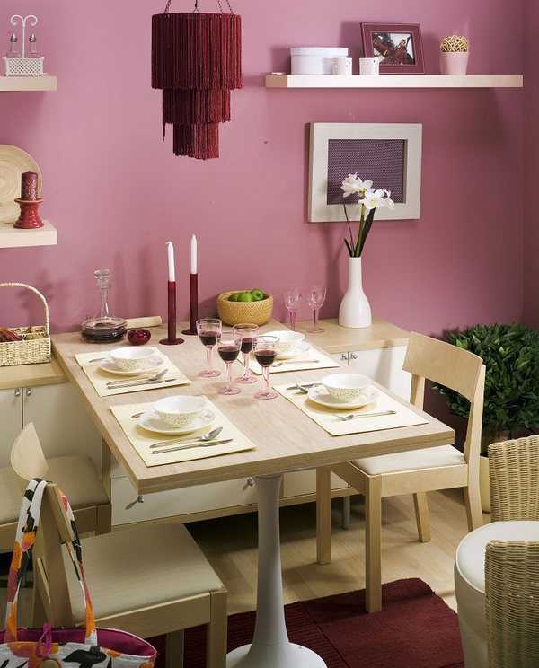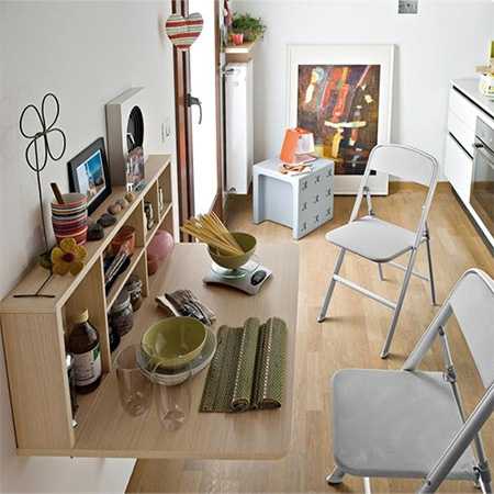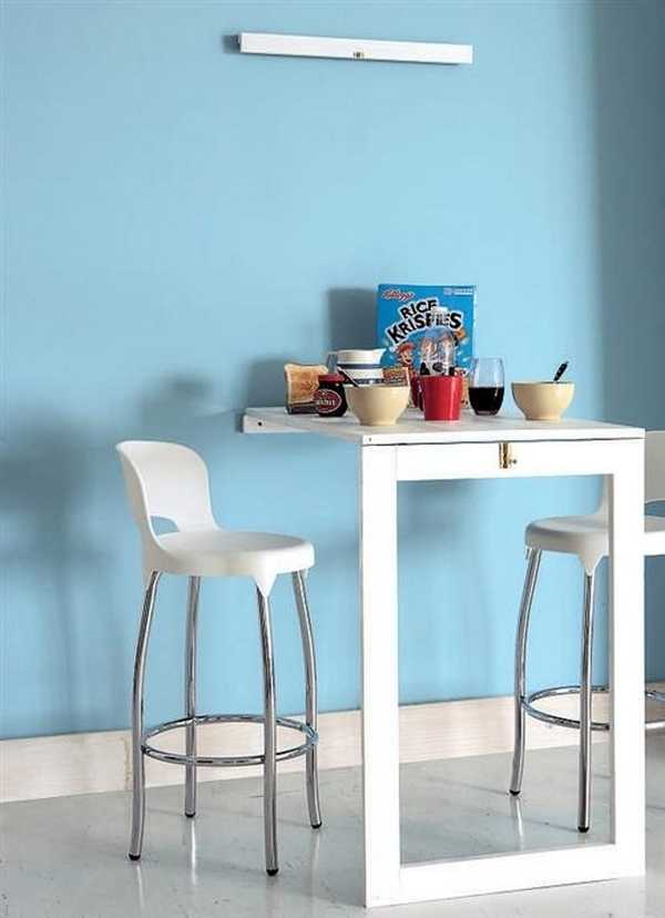 Небольшое пространство требует нестандартного мышления. Вот вам идея – оригинальный откидной столик на кухню, который уж точно не займет лишнего места, точнее в собранном виде он вообще занимает места не больше, чем картина на стене.