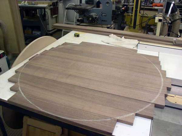 К сожалению, планировка кухни не всегда позволяет обзавестись круглым столиком, с практической точки зрения это не очень удобно. Зато уютно и создает особую семейную атмосферу. Так что если размеры кухни позволяют, сделать круглый кухонный стол – отличная идея. Самая интересная часть, это ножки или одна ножка, смотря как вам больше нравится. В данном случае использована простая конструкция на четырех опорах, но так сказать, в декоративном виде. Для того, чтобы сделать ноги, начните с создания шаблона. Конечно, чтобы получилось красиво, придется повозится, как видите на пошаговых фото, понадобится клей, зажимы и хороший шлифовальный станок.