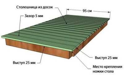 Теперь делаем столешницу стола из досок 950х100х25 мм. Доски можно как прибивать на гвозди, так и прикручивать саморезами. Между досок нужно сделать зазор в 5 мм.
