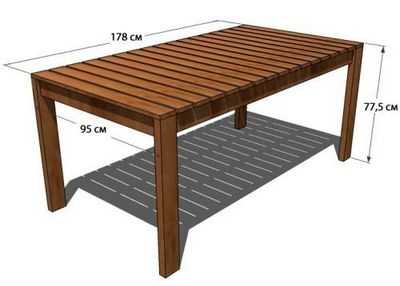 Оптимальный размер столешницы стола для дачи 80х120 см. Меньший по размеру стол будет значительно уступать по функциональности, стол больших размеров будет слишком громоздким и его тяжело будет убирать на зиму. Размер стола 80х120 см позволит проводить торжественные застолья с числом участников 8 – 10 человек.