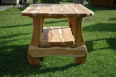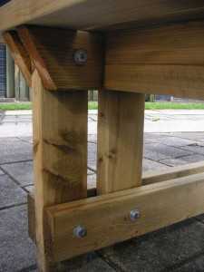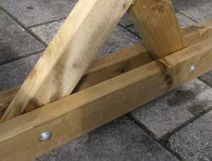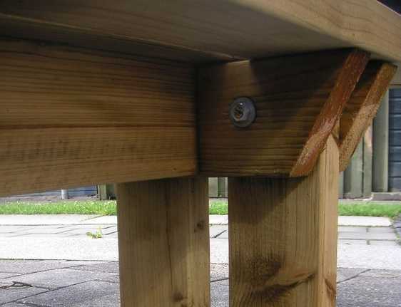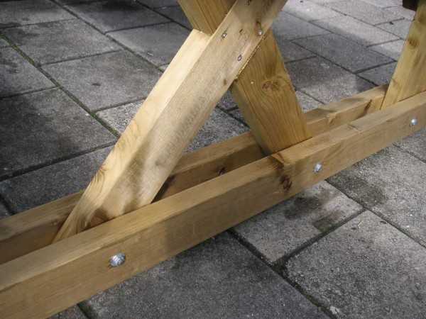 Особенностью конструкции стола в том, что лавочки закрепляются непосредственно на ножках стола. Поперечины, на которые крепятся скамьи одновременно являются стяжкой ножек, а скамьи играют роль продольной стяжки.