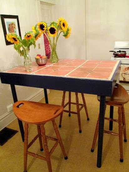 Вам не приходила идея сделать столешницу из плитку? Попробуйте, по-моему довольно оригинально. Особых инструкций не надо, если вы умеете укладывать плитку, конечно. Вся проблема, не только подготовить столешницу, но и правильно выбрать плитку, настенная в этом случае отпадает, потому что толщина должна быть как минимум 5 мм, а лучше толще. К тому же, необходимо подумать и о покрытии, выбирайте лучше матовую, ведь столом будете пользоваться постоянно, а за глянцевой плиткой нужен тщательный уход. На фотографиях ниже показан пример, как это делал автор.
