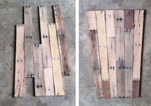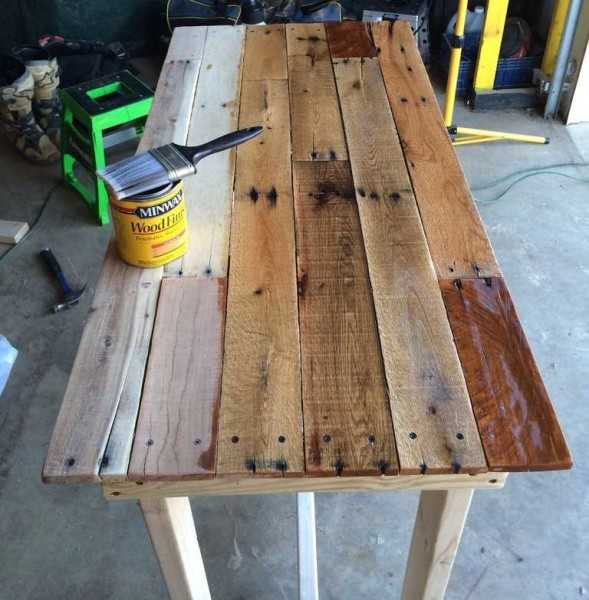 Разобрав паллеты получаем доски с индивидуальным цветом и рисунком. Немного поколдовав, переложив несколько десятков раз их на разный манер, добиваемся требуемого результата. Получается вполне симпатичная столешница.