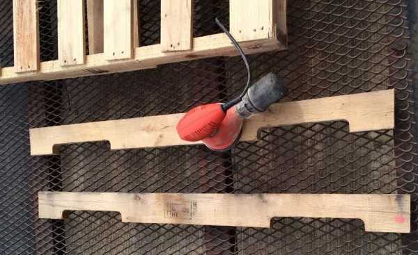 Берем боковые части поддона. Их используем для каркаса стола. Шлифуем их сначала грубой наждачкой, затем тонкой доводим до требуемой гладкости (зерно 120 и 220).