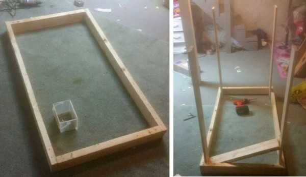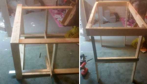 Далее — установка ножек. Выбираем четыре доски одинакового размера, проверяем их длину, корректируем при необходимости. Затем — снова шлифовка. Так проще, чем шлифовать уже прикрученные ножки. Отшлифованные доски прикручиваем к раме. Это и будут ножки На каждую — по два самореза, закрепелнных в диагональ (смотрите на фото). Для большей устойчивости внизу устанавливаем перемычки. От пола до перемычек можно оставить около 10 см. Все соединяем саморезами, чтобы доски не треснули, предварительно сверлим отверстия.