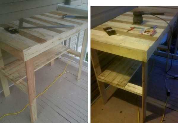 Крепим доски столешницы финишными гвоздями, аккуратно добивая их добойником. На полочке можно закрепить обычными гвоздями или саморезами. Затем шлифмашинкой ровняем. Последний этап — покраска. Очень не повезло с выбором лака. Купили слишком темный, внешний вид не понравился. Придется зашкурить снова и покрасить другим цветом.
