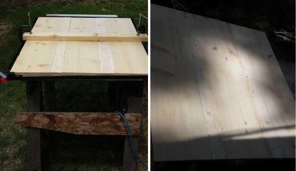 Собранную столешницу переворачиваем и шлифуем. Порядок тот же — сначала наждачной бумагой с крупным зерном, потом — с мелким.