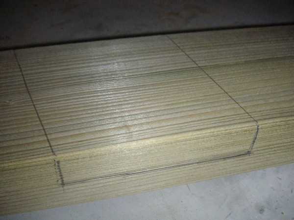 Чтобы соединить ножки в наклонных опорах необходимо сделать прорезь в пол доски.