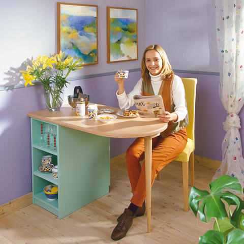 Этот откидывающийся столик можно использовать на кухне или столовой, или даже как письменный стол. Важно хорошо закрепить нижнюю опору, чтобы зафиксировать столешницу, исключив возможность ее падения, особенно, если в доме маленькие дети.