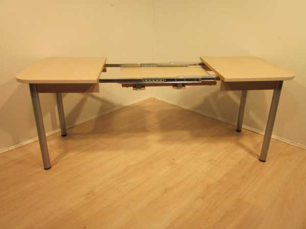 Если вы полностью делаете стол с нуля из своих материалов, вам понадобится циркулярная пила, электролобзик, дрель и шуроповерт. Порядок сборки в принципе такой же, как и обычного стола, только дополнительно изготавливается раздвижная конструкция для вставки из аллюминиевых уголков, а также на средней части столешницы дополнительные петли и защелки.